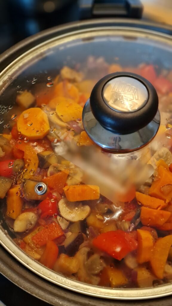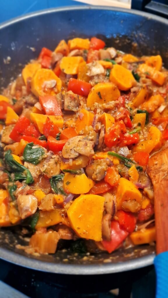 This sweet potato stew is hearty and warming, also very satisfying. Filled fill vegetables, spices, it is a great source of fiber, nutrients and antioxidants. Lentils are added as good source of protein. I use a relatively small amount of lentils as my focus is vegetables but feel free to double the amount if you like.