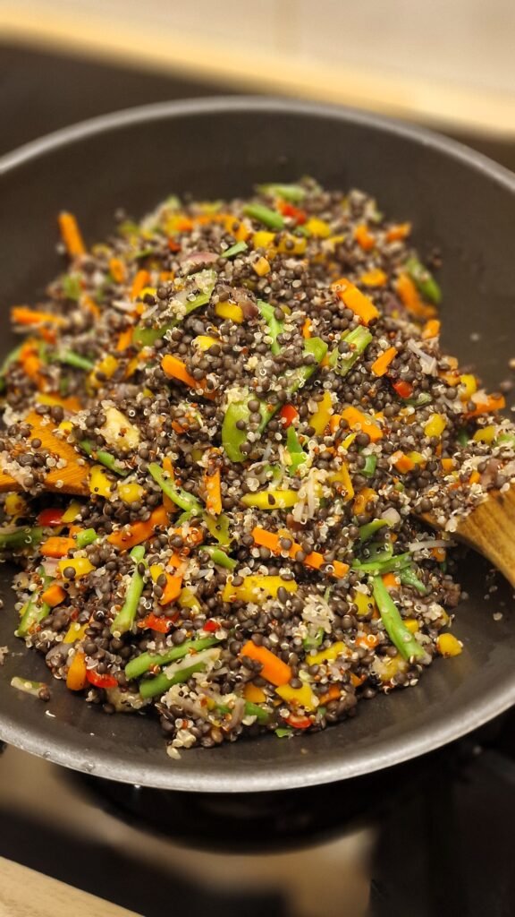 Don’t forget to check on your quinoa and lentils, set them aside when they are cooked. Once vegetables are soft and ready, throw in garlic, cooked quinoa and black lentils. Season with black pepper, paprika, dried herbs and a little olive oil. Mix everything and cook for a couple of minutes.